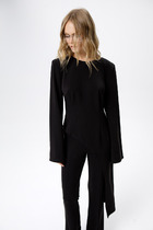 Туника из вискозы подходит для дома и отдыха . Приталенная  юбка в четыре клина к низу расклешена. Кокетка переда  красного цвета отделана декоративной  резинкой  чёрного цвета с прозрачными силиконовым полосками на ней пришита с левой стороны лейба с печатной надписью, манжет рукава также из декоративной резинки с силиконовыми полосами