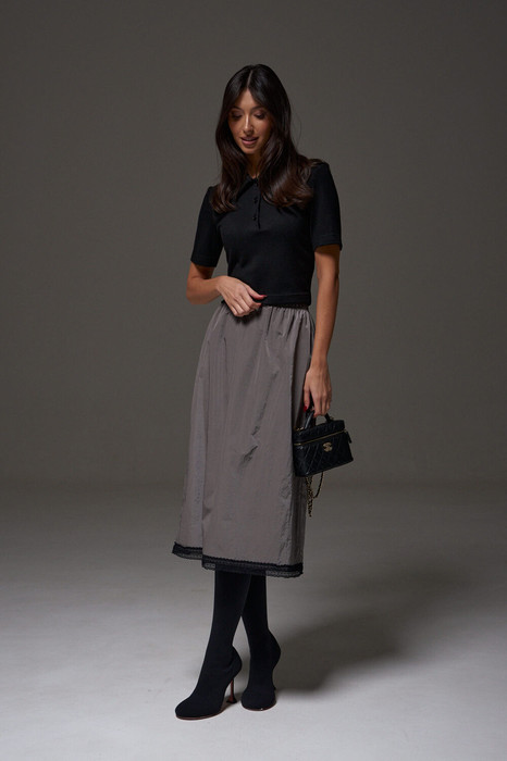 Юбка полуприлегающего силуэта выполнена из ткани плащевки на брендированной подкладе. Характеристики: полуприлегающий силуэт, пояс на резинке, по низу изделия пришито кружево. Длина по боковому шву 77 см.