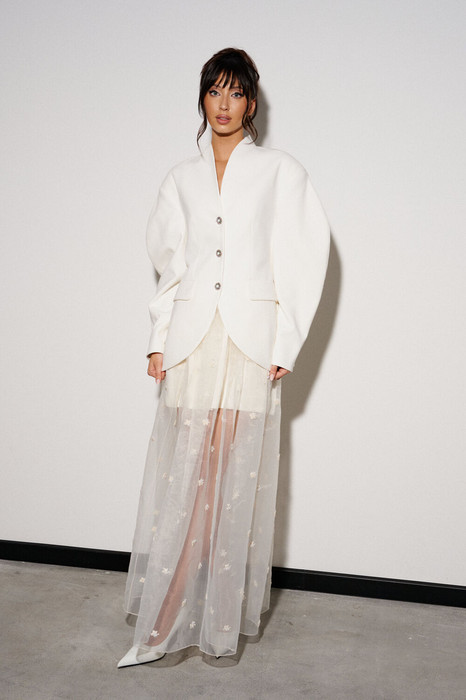 Юбка кроя полусолнце, выполнена из прозрачной ткани молочного оттенка с декоративной вышивкой. Характеристики: крой полусолнце, подкладка юбочка, пояс на резинке со сборкой. Длина юбки по боковому шву 107 см. Длина нижней юбки 41 см.