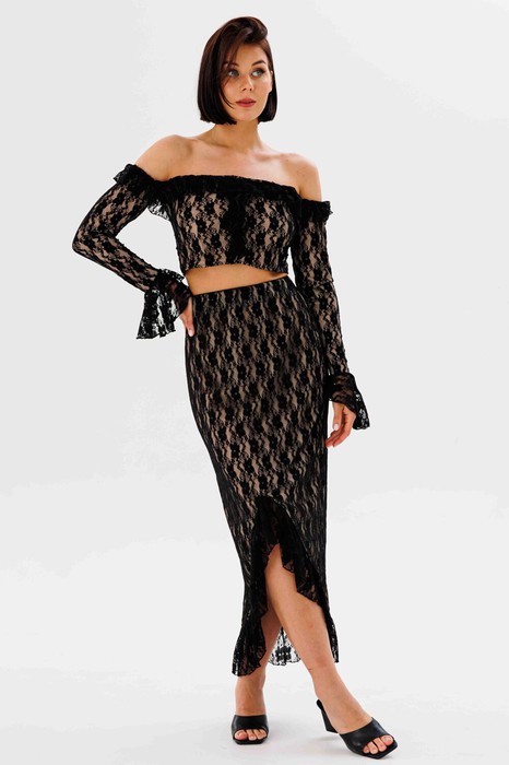 Юбка в длине миди, обработана птрикотажной эластичной подкладкой. Пояс на широкой резинке. По низу обработан волан из гипюра. Перед юбки обработан фигурным разрезом.