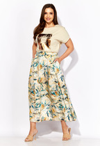 Юбка из пайеток, длинная, по талии с кантом из атласа, по низу сетка. По спинке юбка вытачки и центральный шов, вверху которого застежка на тесьму-молнию, а по низу обработан разрез. Юбка на подкладке из атласной ткани.