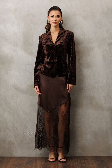 Юбка прямого силуэта из атласа и кружева. Юбка на обтачке. По переднему и заднему полотнищам юбки - вытачки. Юбка с застежкой в боковом шве на потайную тесьму-молнию. Верхняя часть юбки из атласа с асимметричный краем, нижняя часть юбки из кружева с ажурным низом. Юбка без подкладки.