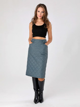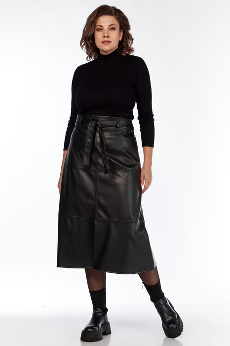 Женская юбка длинны миди, А-силуэта Моделирована подрезами, по переднему полотнищу- разрез, пояс притачной, по спинке посажен на резинку. Дополняет юбку отстроченный съёмный пояс. Юбка выполнена из экокожи высокого качества. Ткань тянется, изнанка в ткани замш. Длина изделия с учётом пояса 78 см.