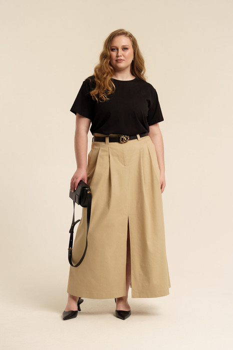 Юбка женская свободного покроя с мягкими складками из джинсовой ткани. Пояс- отрезной с застежкой на молнию и петлю с пуговицей. В боковых швах имеются карманы с листочками. Сзади- настрочные карманы. В переднем и заднем средних швах выполнены высокие разрезы. Есть шлевки для ремня. Длина по боковому шву с поясом - 99 см.