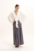 Юбка женская из легкой , струящейся ткани "тенсел", юбка длинны миди с карманами в боковых швах и складками по переду. Пояс со шлевками и застежкой на молнию и петлю и пуговицу. По центру переднего полотнища обработан разрез. Юбка декорирована съемным шнуром из основной ткани.