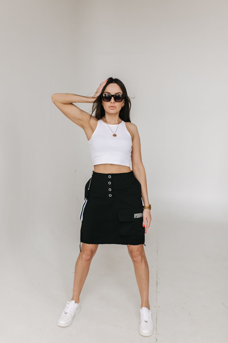 Юбка женская,прямого силуэта с центральной застёжкой на кнопки. На передней половинке накладной отделочный карман с клапаном, средний шов, в боковых швах обработаны карманы. На задней половинке - средний шов. Верхний срез обработан поясом(по спинке с резинкой). В качестве отделки используется фурнитура, отделочные детали,съёмный пояс на карабинах.