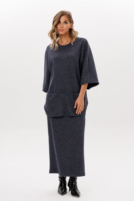 Юбка выполнена из трикотажного полотна. Юбка прямого силуэта, длиной миди, на цельнокроенном поясе с эластичной тесьмой. Сзади разрез в среднем шве.