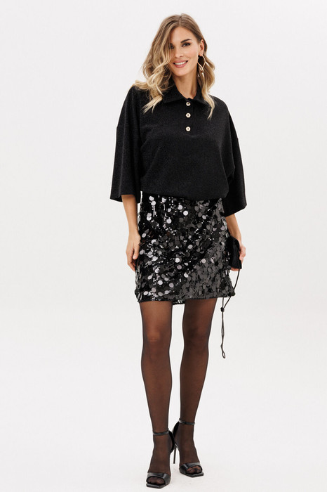 Юбка выполнена из трикотажного полотна в крупные пайетки на сетке. Юбка прямого силуэта, длиной выше колена. Юбка на притачном поясе из бархата, с эластичной тесьмой.