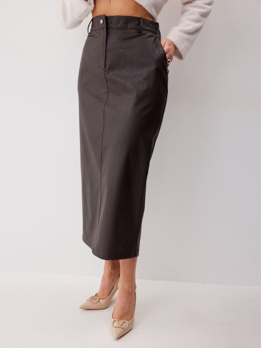 Юбка-карандаш женская из искусственной кожи. Длина юбки до середины икры. По переду в юбке обработаны карманы с отрезным бочком, по концам кармана установлены хольнитены. Перед юбки с центральным швом, в котором обработан гульфик с застежкой – молнией. Спинка юбки со средним швом в котором располагается разрез. Верх спинки юбки с отрезной фигурной кокеткой и вытачками. Верхний срез юбки обработан отрезным поясом, с резинкой по спинке и шлевками. Пояс застегивается на кнопку.