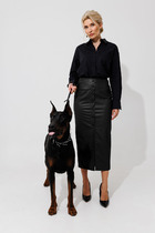Юбка из эко-кожи на хлопковой основе, расклешенная книзу, на притачном поясе со шлевками для ремня, без подкладки. Переднее полотнище со средним швом, понизу с разрезом. Заднее полотнище с потайной застежкой на молнию в среднем шве. В области бедер обработаны накладные карманы с клапаном. В комплект входит съемный ремень из основной ткани.