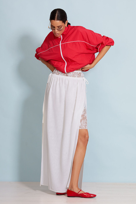 Юбка выполнена из тонкого полупрозрачного льна. Прямая. Длина maxi. Пояс регулируется . Высокие разрезы по боковым швам. Кружевной  подъюбник входит в комплект.