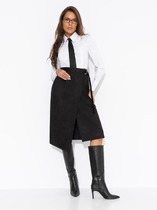 Юбка прямая на подкладке, до середины колена на поясе, с резинкой по бокам. Застежка в среднем шве спинки на пуговицу и молнию, по спинке шлица.
