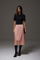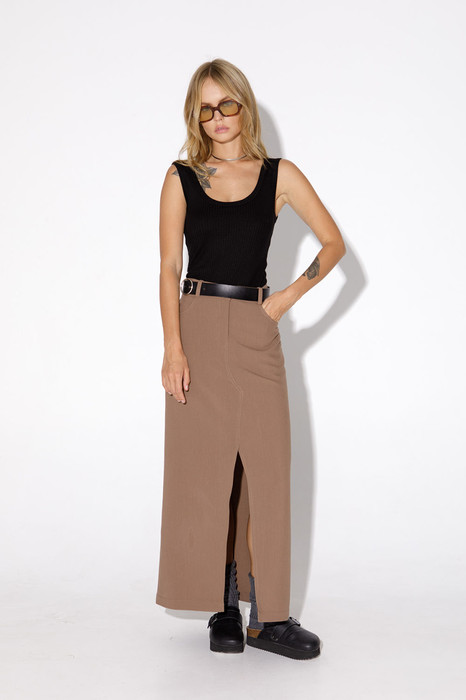 Асимметричная миди-юбка с разрезом. Детали: юбка асимметричного кроя с высоким разрезом по переду, притачной пояс со шлевками, застежка на молнию и пуговицу, боковые карманы.