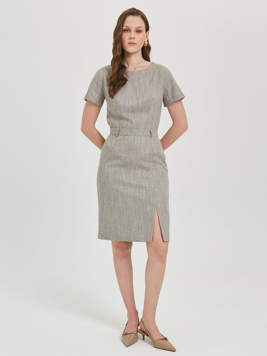 Модель прямого силуэта, на подкладе и притачном поясе со шлёвками. Спереди в рельефе высокий разрез. Сзади прорезной карман с листочкой и застёжкой на пуговицу. В среднем шве обработаны шлица и застёжка на потайную молнию и пуговицу на поясе. Ремень в комплект не входит.