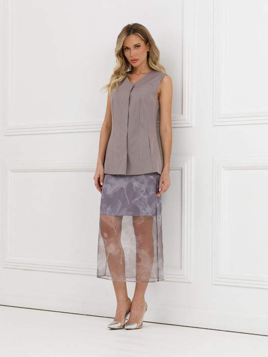 Модель прямого силуэта, на кокетке, на подкладе. Сзади в среднем шве обработаны потайная застёжка молния и высокий разрез.