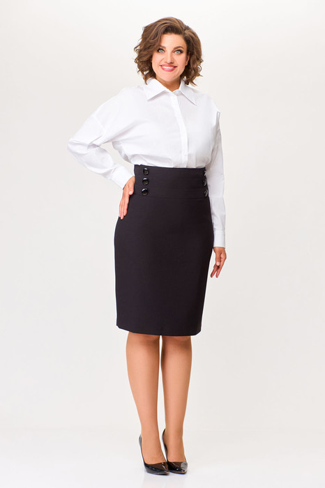 Юбка на подкладке прилегающего силуэта слегка заужена к низу, с завышенной талией. На заднем и переднем полотнище кокетка, состоящая из трех частей. Средний шов спинки с застежкой на потайную тесьму молнию и  шлицей по низу. По швам стачивания кокеток задней и передней половинок юбки проложена отделочная строчка на 0,2 см по обеим сторонам шва. По линии притачивания кокетки также проложена отделочная строчка на 0,2 см. На кокетке передней половинке юбки пришиты 6 отделочных пуговиц.