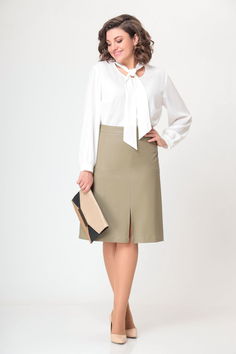 Юбка полуприлегающего силуэта, выполнена из экокожи на хлопковой основе. Юбка на подкладке. Перед и спинка со средним швом и горизонтальными рельефами, отстроченными отделочными строчками. По спинке юбки обработаны вытачки. Застежка на потайную молнию в среднем шве заднего полотнища. Верх юбки обработан притачным поясом. В среднем шве переда расположен разрез.