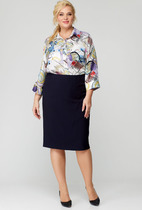 Переднее полотнище с талиевыми вытачками. Заднее полотнище с талиевыми витачками и средним швом, в верхней части с застежкой на потайную тесьму-молнию, в нижней – со шлицей. Средняя длина юбки по боковому шву заднего полотнища 63,0см (±3,0 см). Тип ткани: трикотажное полотно.
