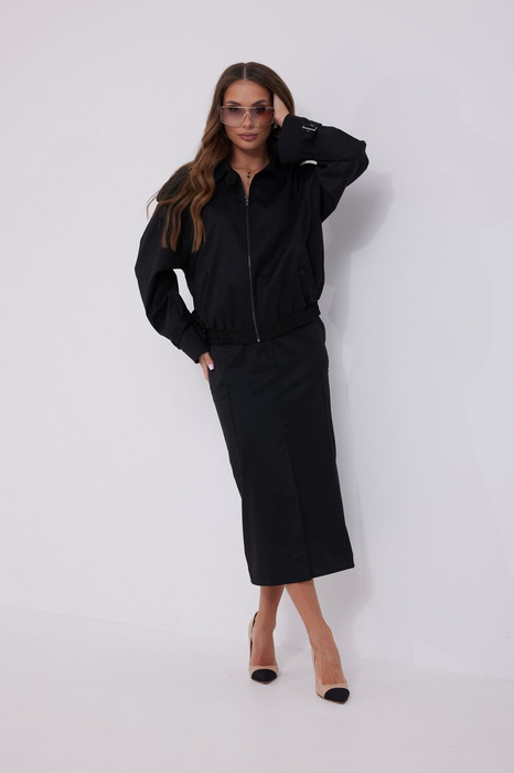 Юбка прямая из костюмной ткани. Длина миди. Верх на поясе со шлевками. Застежка по переду на молнию и кнопку на поясе. В комплекте съемный ремень. В боковых швах карманы. По низу переда юбки шлица. На боковых швах накладные карманы. Длина 85 см.