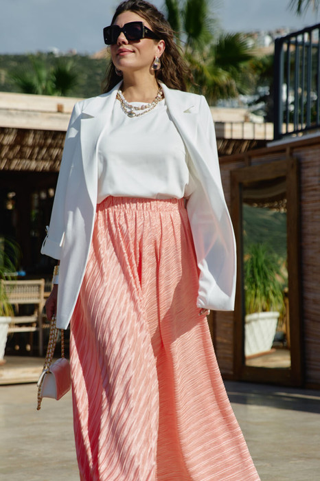 Юбка «полусолнце» в длине миди с жатой фактурой — это сочетание лёгкой драматичности и непринуждённой элегантности. Её силуэт создаёт мягкую визуальную волну, а жатая поверхность превращает каждый изгиб в игру света и тени: она одновременно утончённая и характерная, романтичная и по-городски современная. Из-за сжатой фактуры ткани юбка выглядит живой и объёмной.