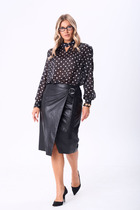 Юбка длины «миди», трапециевидного силуэта с декоративными вставками в виде отстроченных клиньев. Белые лепестки принта контрастируют с чёрным фоном юбки создавая акцент в образе. Отстроченные клинья создают динамику движения когда юбка колышется при ходьбе. Клинья расходятся от талии мягкими волнами, создавая объём там, где нужно, и облегая там, где требуется. Каждый шов — это тщательно продуманная линия, направляющая взгляд по изгибам фигуры. Юбка сидит по фигуре, но не обтягивает, оставляя пространство для лёгкого бриза. Пояс в юбке обтачной, со вставкой эластичной тесьмы резинки в бочках для удобной посадки на фигуру. В среднем шве спинки застёжка на потайную тесьму-молнию. Длина юбки 87 см (р 50-54), 88 см (56-60).