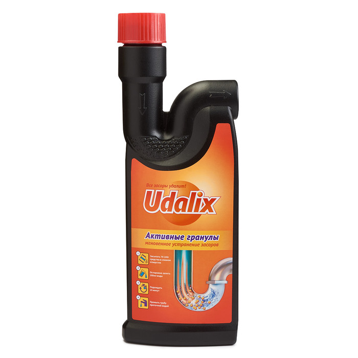 Средство от засоров Udalix растворяет органические засоры, волосы, жировые загрязнения, устраняет неприятные запахи. Применяется для прочистки канализационных труб и сливных отверстий. Может использоваться для профилактики возникновения загрязнений и засоров, безопасно для металлических и пластиковых труб.