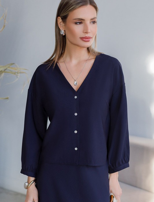 Состав: 92%Лиоцелл (Вис) 8%ПЭЭлегантная укороченная блузка темно-синего цвета выполнена из плотного лиоцелла. Лиоцелл это более дорогой и экологичный вариант вискозы, очень прочный и шелковистый. Ткань отличается от регулярной коллекции из лиоцелла - она содержит еще больше лиоцелла (92%), благодаря чему имеет более нежную шелковистую фактуру. Модель дополнена объемными рукавами длиной 7/8, создающими модный акцент. Укороченная передняя часть блузки выгодно подчеркивает линию талии, а удлиненная спинка обеспечивает комфорт. Этот асимметричный фасон придает образу динамичности, а V вырез визуально вытягивает силуэт. Свободный крой романтиной блузки не сковывает движений и отлично садится по фигуре даже на большие размеры, скрывая возможные недостатки. Эта легкая блузка с застежкой на пуговицы идеальный выборо для комфорта и стиля в теплое время года, она идеально адаптируется под любой повод.