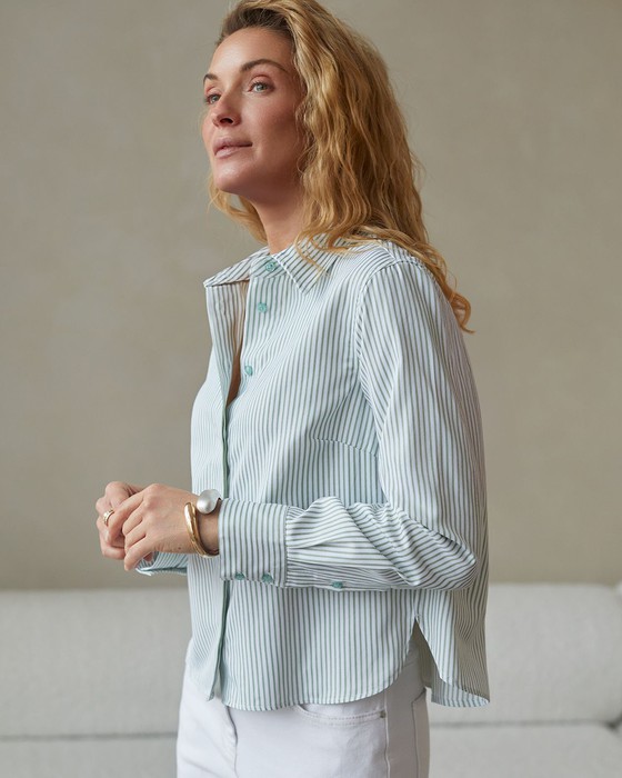 Состав: 65%Хлопок 35%ПЭ Плотность: 112 Г/м2Стильная укороченная блузка белого цвета в фисташковую полоску создана для комфорта в любой ситуации. Хлопок делает модель приятной для тела и хорошо дышащей, что особенно важно в течение долгого дня. Свободный крой не ограничивает движения, подходит на любую фигуру и гармонично смотрится в разных образах. Всегда актуальный принт в полоску визуально вытягивает и стройнит фигуру, добавляет образу динамики, делая блузку эффектным акцентом в гардеробе. Повседневная блузка держит форму даже после продолжительной носки, что помогает всегда выглядеть аккуратно. На спинке блузки расположена встречная бантовая складка с наклоном, что создаёт красивый визуальный эффект и придаёт дополнительный объем. Рукава обработаны широким манжетом на 2 пуговицы. Дополнительная пуговица на планке рукава не даёт раскрываться и топорщиться разрезу. Отложной воротник придает классический вид,, подходящий для офисных будней. Особенно стильно рубашка смотрится в непринужденных, городских или повседневных комплектах.