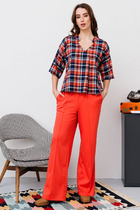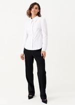 Блузка классического прямого кроя с длинными рукавами на манжетах и застежкой на планку с пуговицами.