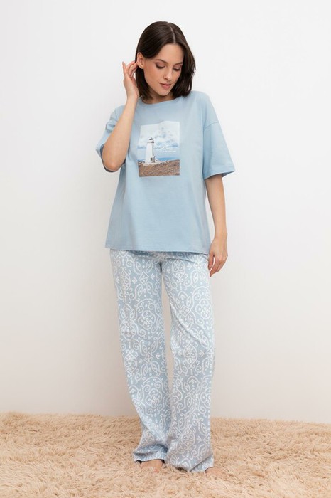 Совместные покупки Уфа Женская одежда Домашняя одежда — Very Neat брюки жен Е 40046/голубой,кружевной узор