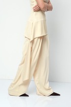 Брюки свободного кроя с декоративными складками и боковыми карманами из плотного гладкого трикотажа интерлок. Застёгивается спереди на молнию и кнопку. Пояс по спинке на резинке. В составе 85% натурального хлопка и 15% полиэстера, при этом полиэстер ввязан внутрь по особой технологии и не соприкасается с кожей.