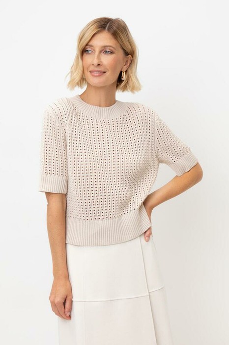 Джемпер с коротким рукавом ажурной вязки из итальянского хлопка. Умеренное переплетение, хлопок в составе придают изделию форму и дают ощущение комфорта во время носки. Незаменим в повседневном летнем гардеробе.