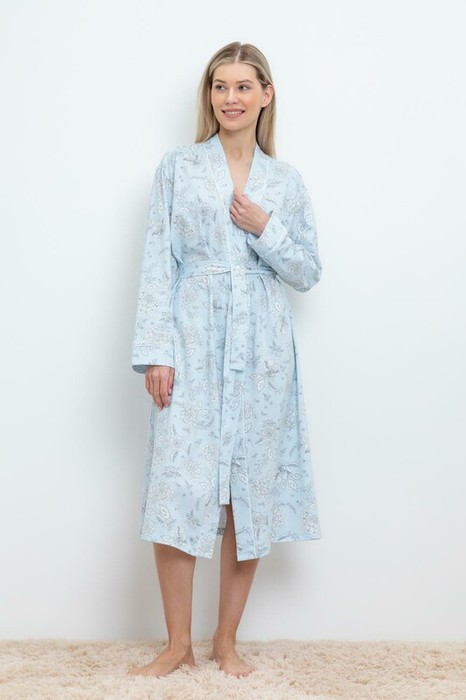 Уютный легкий халат из набивного трикотажа на запах с длинными рукавами. В боковых швах два удобных кармана. С помощью пояса можно регулировать посадку и силуэт. Гладкий материал приятен к телу и позволяет коже дышать.