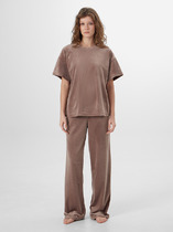 Комплект из объемного трикотажа с добавлением эластичных волокон. Свободный силуэт, мягкий пояс и отсутствие боковых швов на брюках обеспечат комфорт во время сна и отдыха.