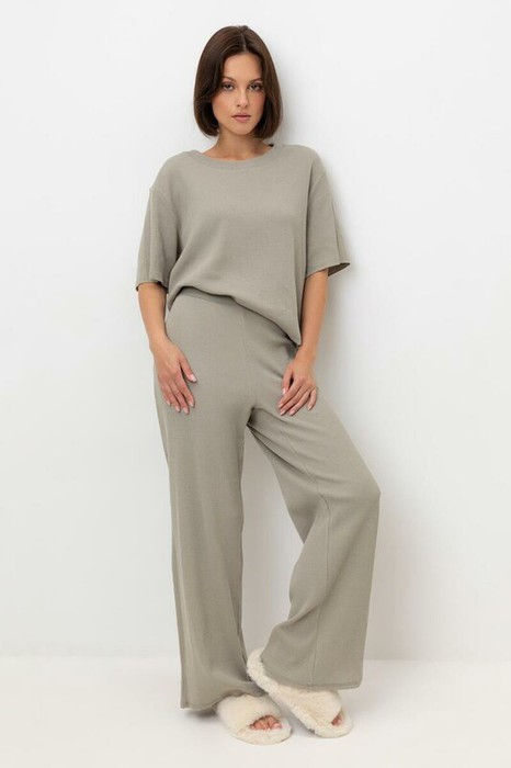 Комплект из объемного трикотажа с добавлением эластичных волокон. Свободный силуэт, мягкий пояс и отсутствие боковых швов на брюках обеспечат комфорт во время сна и отдыха.