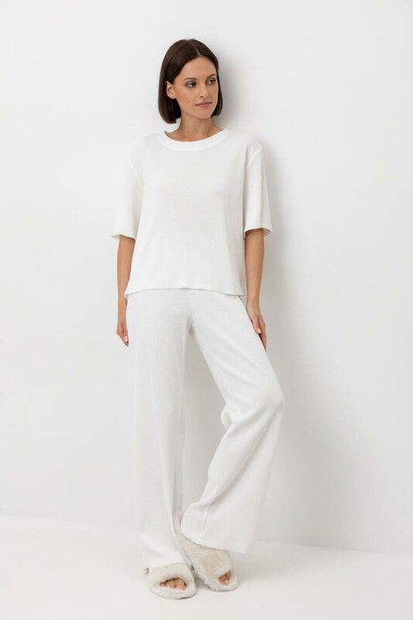 Комплект из объемного трикотажа с добавлением эластичных волокон. Свободный силуэт, мягкий пояс и отсутствие боковых швов на брюках обеспечат комфорт во время сна и отдыха.
