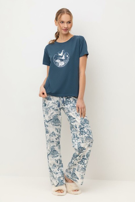 Комплект приглушенного синего оттенка выполнен из хлопка с нежнейшим модалом. Свободный крой футболки и мягкий пояс брюк обеспечивают легкость и свободу движений.