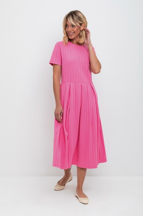 Платье в складку с круглым вырезом и короткими рукавами из плотного гладкого трикотажа интерлок в рубчик.                                                                                                                                Все трикотажные полотна производятся в соответствии с нормами Швейцарского сертификата ЭкоТекс. Сделано в России