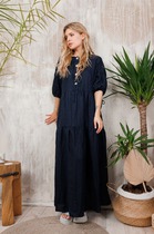 Платье с круглым вырезом и короткими рукавами из плотного трикотажа интерлок. Модель с трапециевидной юбкой и боковыми карманами.