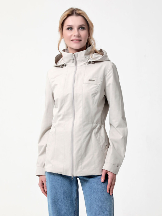 Ветровка полуприлегающего силуэта с втачными рукавами и застежкой на двухзамковую молнию. Воротник - стойка, капюшон  съемный.  Карманы застегиваются на кнопку. Длину рукава можно менять посредством паты, а линию талии подчеркнуть с помощью кулиски.