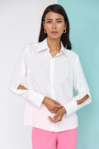 Укороченная блузка с пышными рукавами-фонариками выполнена из легкого хлопкового поплина. Супатная застежка на пуговицы из натурального перламутра. Внизу кулиса с лентами из основного полотна. В изделии будет комфортно, даже в самое жаркое время года. Подходит для любой фигуры. Сочетается в костюме с кюлотами D24.233 и юбкой D26.179