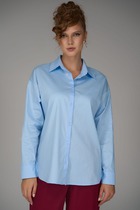 Блузка полуприталенного силуэта выполнена из эластичного хлопка. Особое внимание рукавам придают длинные манжеты – декоративный и функциональный элемент. Застежка на перламутровые пуговицы. Совет стилиста: используйте блузку в комплекте с джинсами прямого кроя, чтобы создать городской расслабленный образ. В паре с цветными брюками, на контрасте или в классическом черном сочетании, с жакетом.