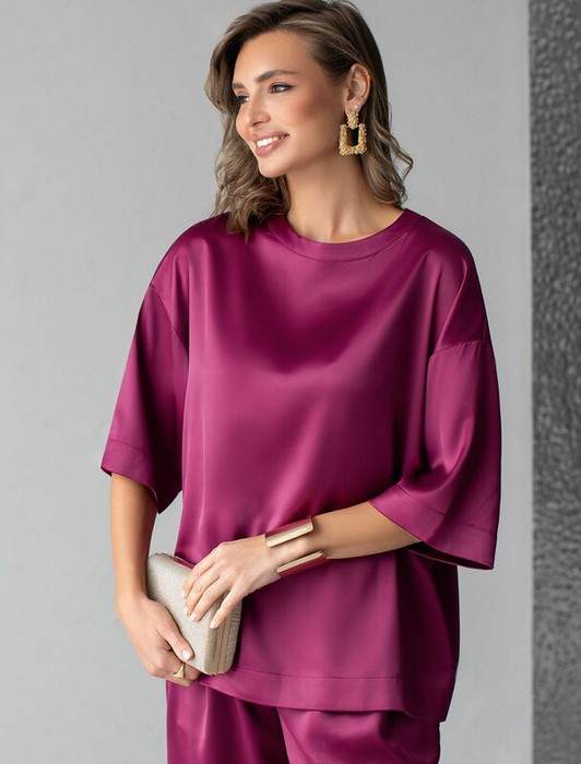 Свободный крой блузки и спущенная линия плеча дарят ощущение легкости и непринужденности, делая образ одновременно женственным и современным. Широкие рукава средней длины гармонично дополняют образ и идеально подходят для полных рук, обеспечивая комфорт, свободу движений и уверенность. Аккуратная застежка на маленькую пуговицу добавляет утонченности, а круглый вырез красиво обрамляет шею, создавая аккуратную линию декольте.