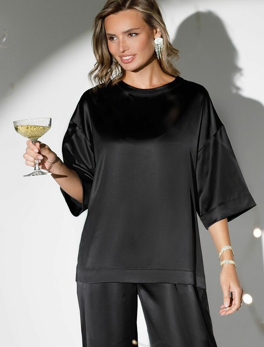 Совместные покупки Уфа Женская одежда Блузки, рубашки — Vilatte Блузка свободная из струящегося плотного сатина D29.279 черный
