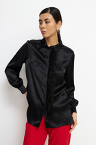 Блузка свободного силуэта выполнена из смесовой струящейся ткани. Модель в вертикальную полоску дополнена золотистыми рельефными пуговицами. Свободный силуэт подходит для любой фигуры. Для идеального роскошного образа используйте в качестве низа брюки светлых тонов. На спинке изделия фирменный металлический логотип бренда.