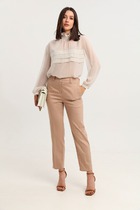Брюки выполнены из плотного лиоцелла. Модель дополнена карманами и высоким поясом на пуговицах. Ткань изделия отлично держит форму, плавно драпируется и не просвечивает. В теплое время года приятно охлаждает кожу. Добавление синтетических волокон в составе изделия, предотвращает сминаемостьи поддерживает формоустойчивость. Брюки сочетаются в костюме с топом D23.063 и блузкой D29.266, D29.267 и жилетом D27.002