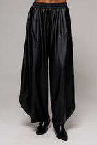 Брюки-палаццо выполнены из эластичной поливискозы. Легкая и струящаяся ткань идеально подойдет для повседневных образов.  Модель с высокой посадкой визуально стройнит и вытягивает силуэт, удлиняет ноги.  По верхнему краю спереди классически заложены складки, что придает свободы и простора в районе бедер. Свободный силуэт подходит для любой фигуры.