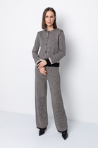 Брюки-палаццо выполнены из костюмной ткани. Свободная модель дополнена карманами и поясом на резинке сзади. Посадка на талии и заутюженные стрелки визуально удлиняют ноги и вытягивают силуэт. Идеальный вариант для офисного дресс кода или в повседневный классический стиль.