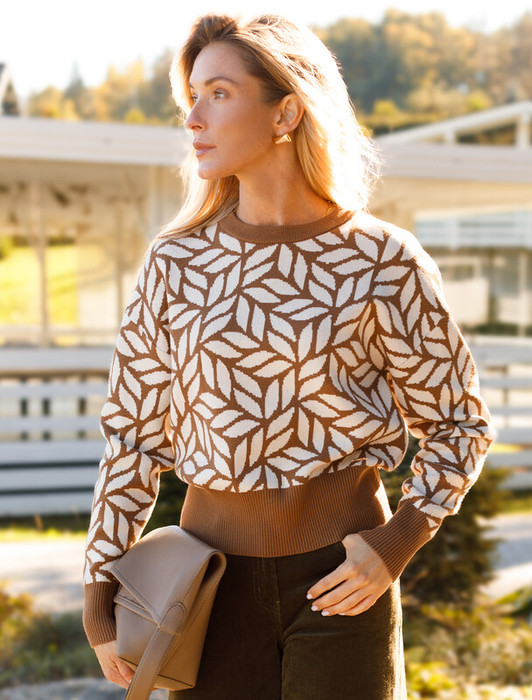 Джемпер жаккардовой вязки выполнен из мягкой пряжи на основе вискозы с добавлением кашемира. Очень приятная на ощупь пряжа дарит абсолютный комфорт, сохраняя оптимальную температуру не перегревая. Совет стилиста: модель с круглым вырезом и спущенной линией плеч гармонично дополнит повседневные образы с джинсами или брюками, при этом будет также выигрышно сочетаться с юбкой в заправку.