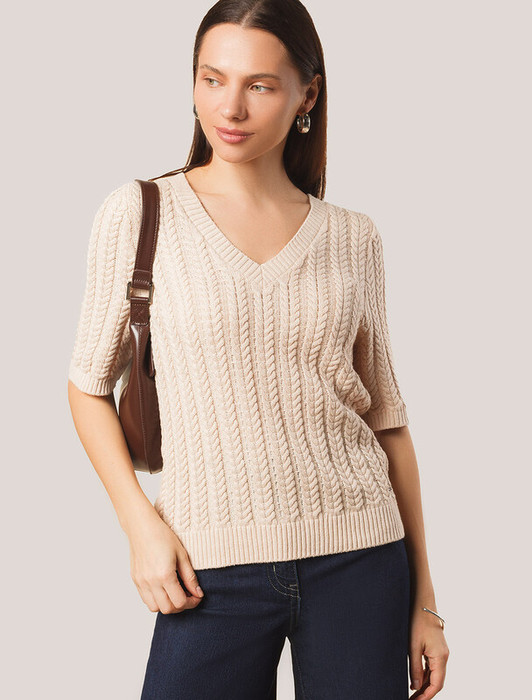 Совместные покупки Уфа Женская одежда Джемперы, свитеры, водолазки — Vilatte Джемпер фактурной вязки из хлопка с кашемиром D39.349 бежевый меланж